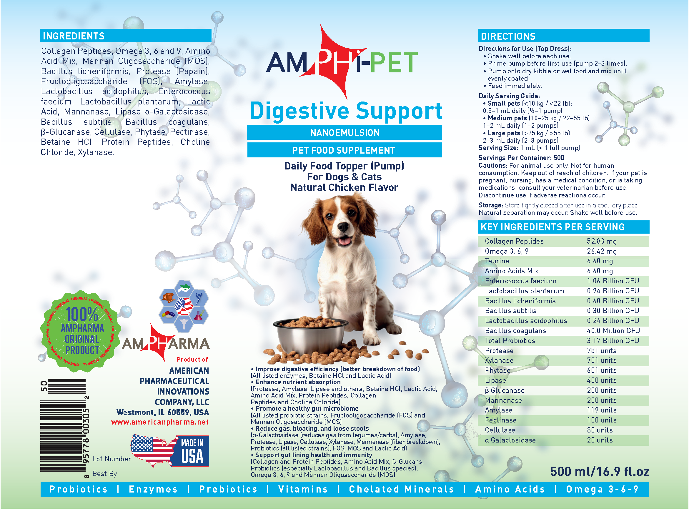 - AmphiPET Digestive Support nanoemulsion liquid is a nano-emulsion concentrated, multi-component nutritional supplement designed to be applied to pet food via pump. It contains a synergistic blend of digestive enzymes, prebiotics, probiotics, organic acids, essential amino acids, nutraceuticals and chelated minerals. This comprehensive formulation is intended to support overall digestive health, enhance nutrient absorption, and promote well-being when used as part of a balanced diet. The nanoemulsion liquid application ensures easy mixing with both dry kibble and wet food.