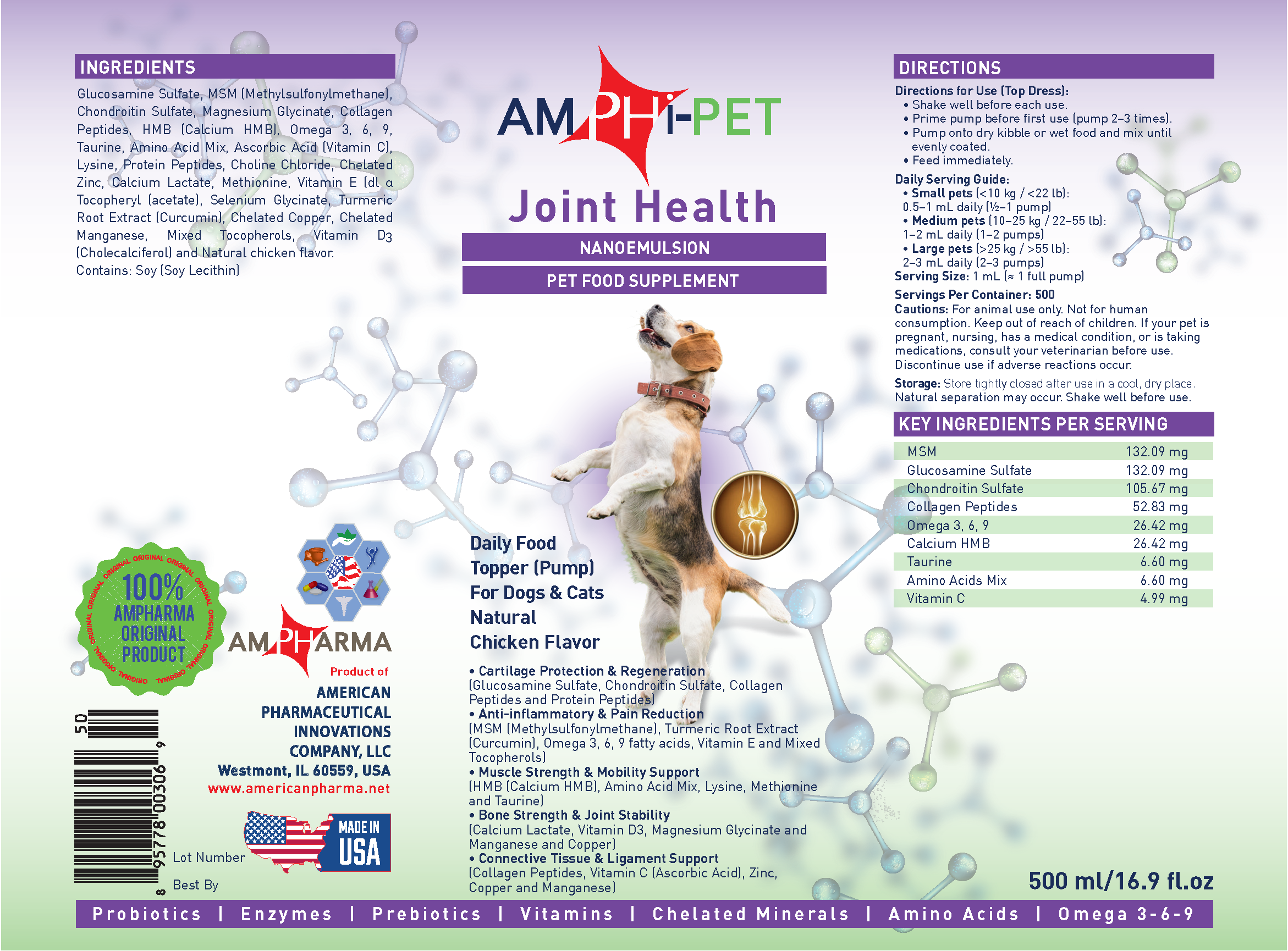 - AmphiPET Joint Health Pump is a comprehensive joint-support formula designed to maintain mobility, flexibility, and comfort in dogs. It combines natural joint protectants, anti-inflammatory extracts, omega fatty acids, collagen, and chelated minerals to help protect cartilage, reduce stiffness, and support long-term joint health