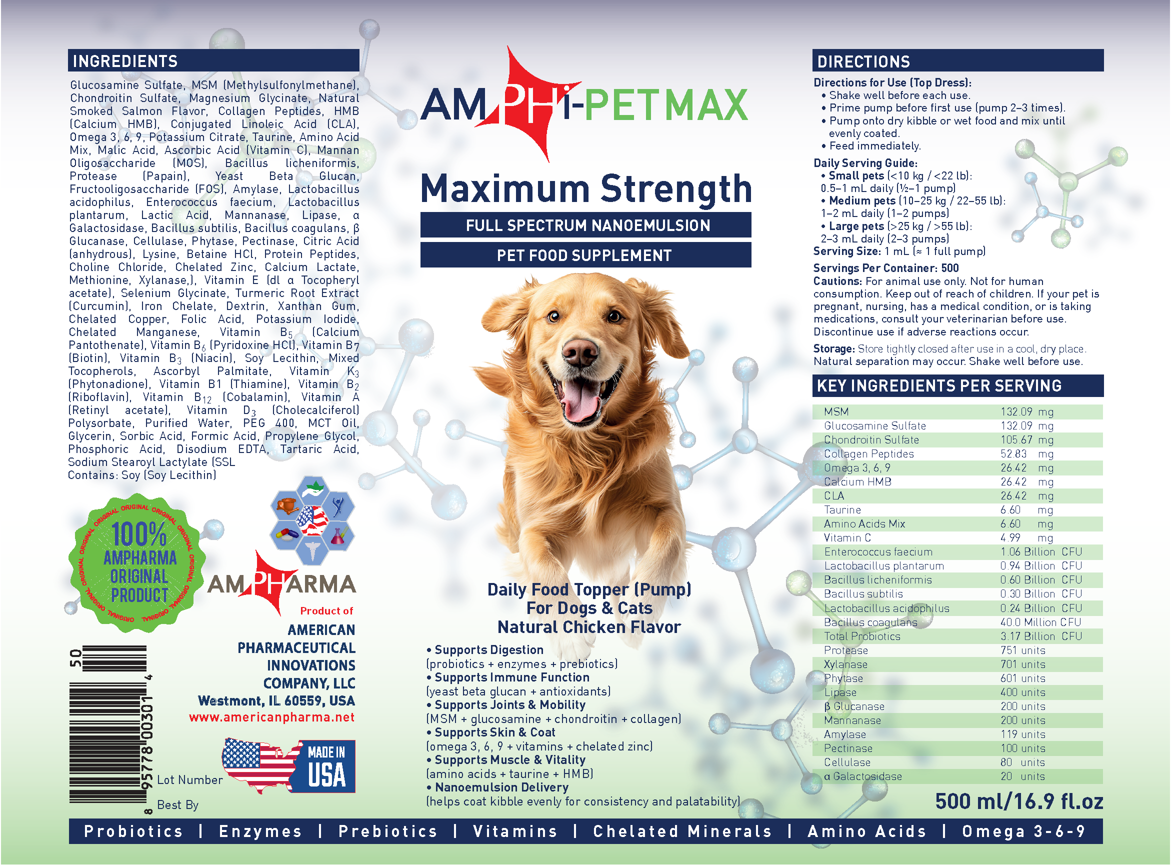 - AmphiPET Maximum Strength pump includes several omegas. They, especially EPA and DHA, have a number of therapeutic uses in dogs and cats include: