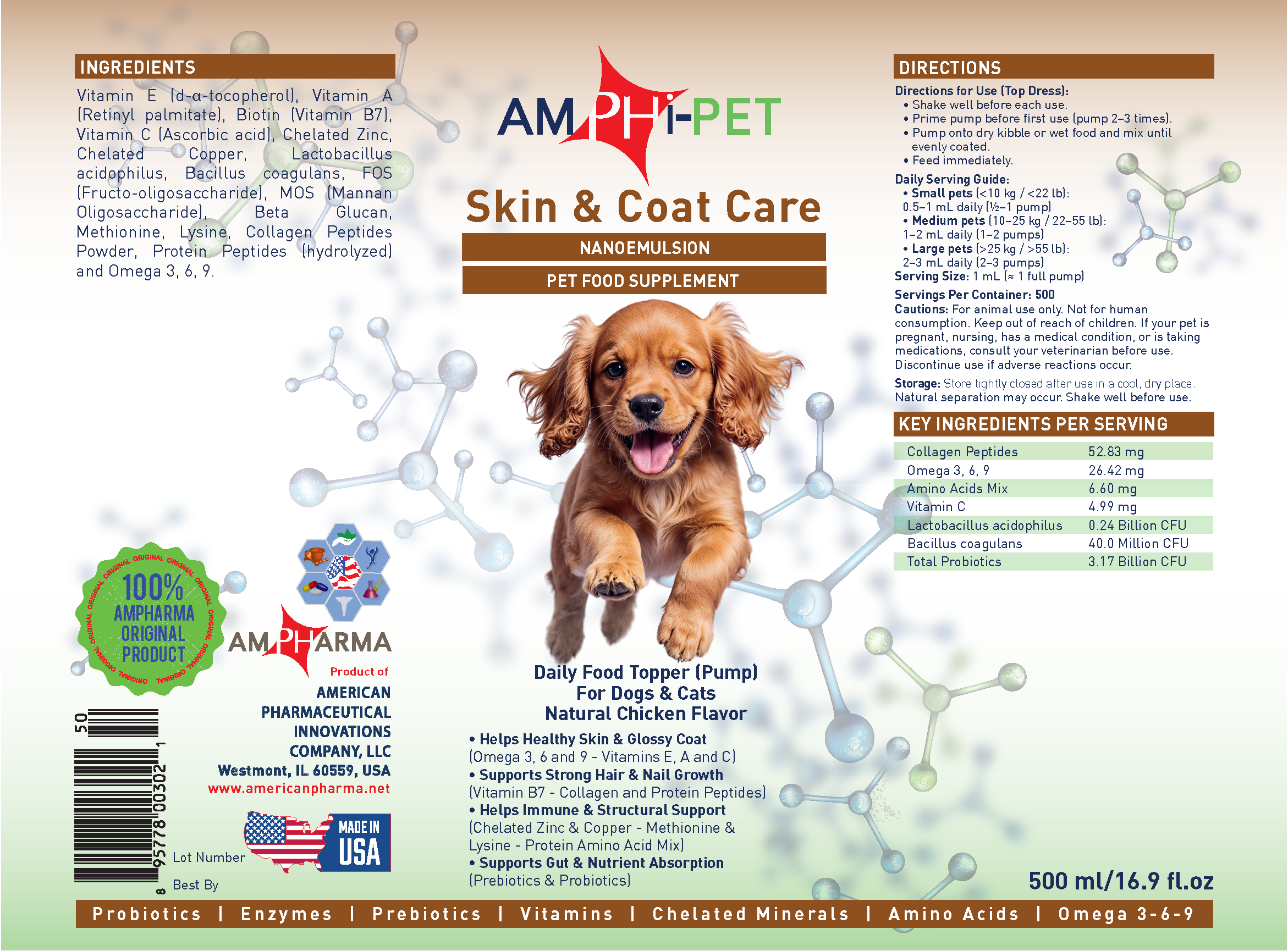 - AmphiPET Skin and Coat pump is a scientifically formulated supplement designed to support healthy skin, a glossy coat, and overall vitality in dogs and cats. It provides essential fatty acids, vitamins, chelated minerals, amino acids, peptides, and prebiotics/probiotics to promote strong skin barrier function, reduce shedding, and enhance coat brilliance.